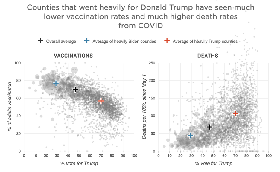 It’s interesting that a new analysis by NPR suggests that Republicans are probably dying at a higher rate as a result of their much lower vaccination rate. A nationwide comparison of 2020 presidential election results and COVID-19 death rates since vaccines became available for all adults, found that counties that voted heavily for Trump had nearly three times the COVID-19 mortality rate of those that went for Joe Biden. Those counties also had far lower vaccination rates.
